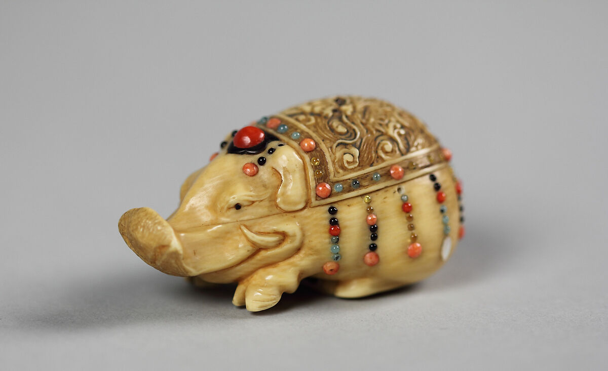 The Osaka carver embellished the back of the boar with a decorative cover with colorful semiprecious stones mimicking hanging beads. Such covers were normally worn by elephants.