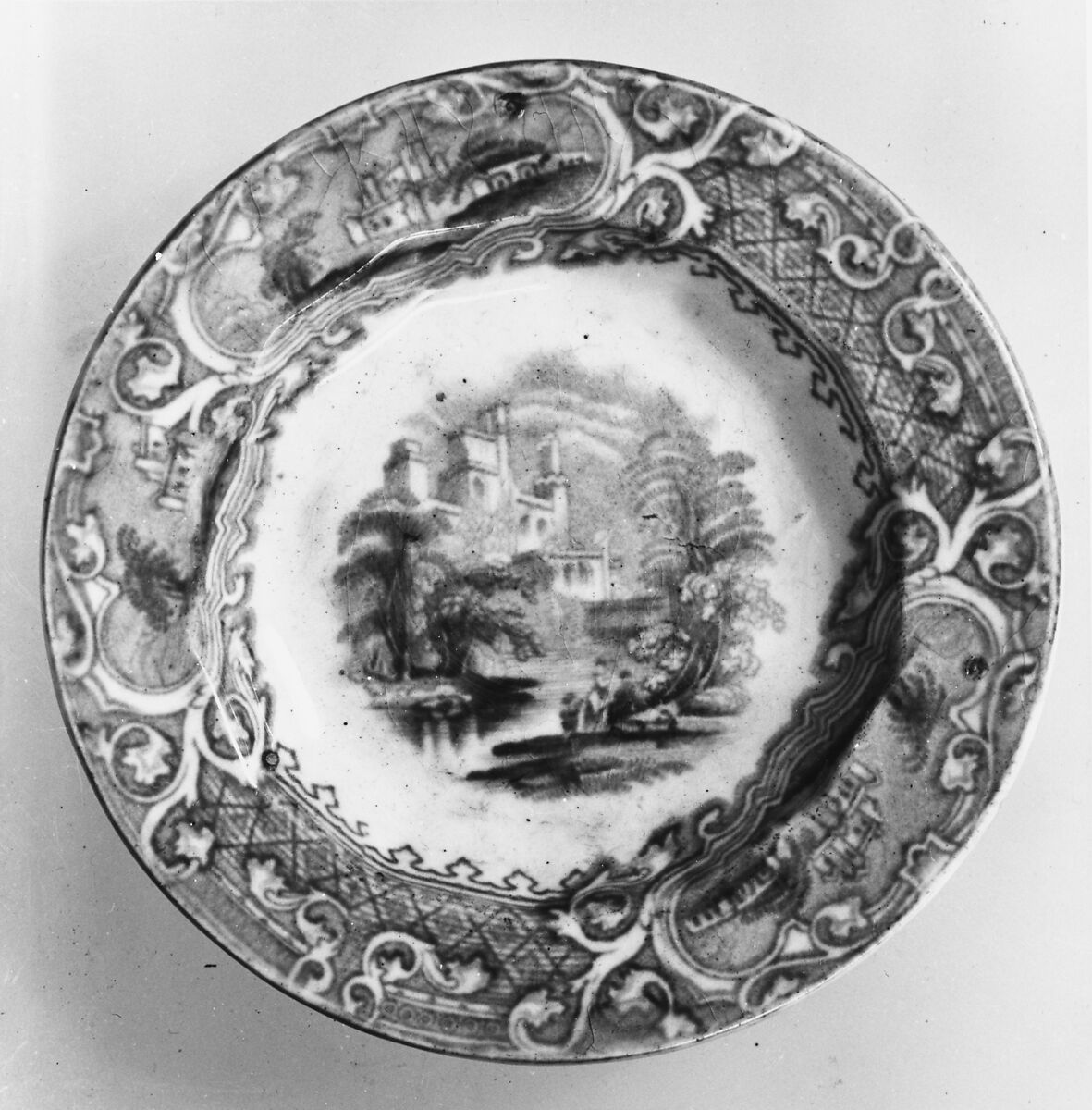 This blue and white transfer-printed earthenware cup plate made by the Staffordshire firm of E. Challinor & Co. features a romantic scene known as "Priory." Refer to the Dictionary for definitions of the terms "cup plate" and "transfer printing" and for information about Challinor.
