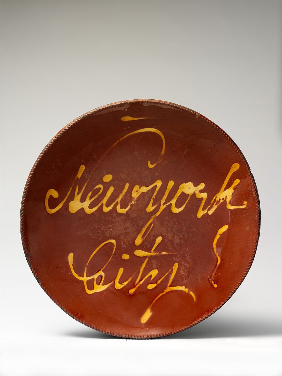 Many redware plates embellished withnames or legends such as “Apple Pie,”“Mary’s Dish,” or, in this case, “New York”are attributed to the Smith Pottery of Norwalk.