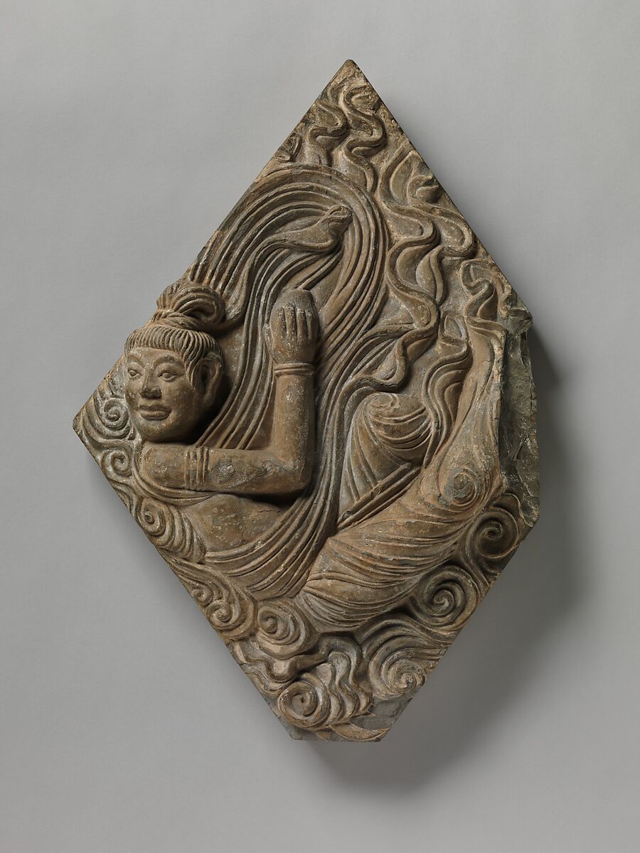 Celestial attendants to both Buddhist and Hindu deities in South Asia, apsaras are also frequently depicted in East Asia Buddhist art. This diamond-shaped tile may have decorated the exterior of the pagoda of the Xiuding Temple near Anyang in Henan Province