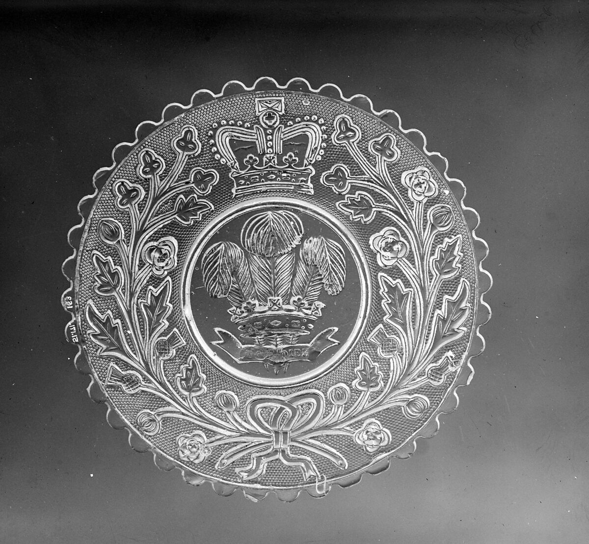 The crown with three plumes pressed into the center of this plate refers to the Prince of Wales, lending support to the thesis that the plate commemorates the birth in 1842 of Victoria and Albert's first son. The border decoration includes the thistle symbolizing Scotland, the shamrock for Ireland, and the rose for England and is very similar to the border of another plate in the collection, 51.171.162. While this plate is most likely of English origin, it is possible that such plates may have been manufactured in America as well.