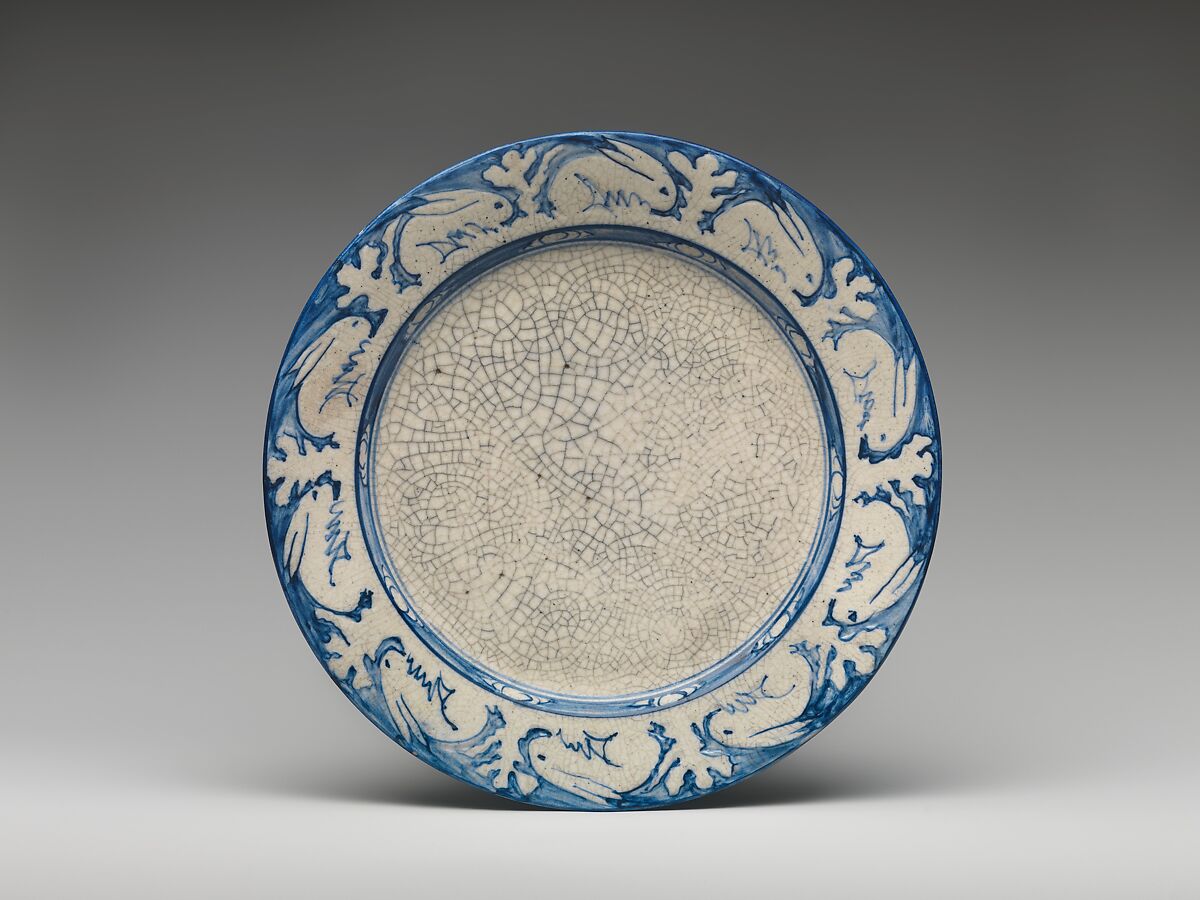 This earthenware plate features the crackle glaze first developed by Hugh Cornwall Robertson (1844–1908) when he worked at his family’s pottery Chelsea Keramic Art Works. The border design of the repeated motif of a simplified rabbit was designed at Chelsea Pottery, a firm that later became the Dedham Pottery Company. The incised outlining of the rabbit border is rare and found only on the earliest examples of this pattern. The rabbit border would become the most popular and plentiful border design of the Dedham Pottery.