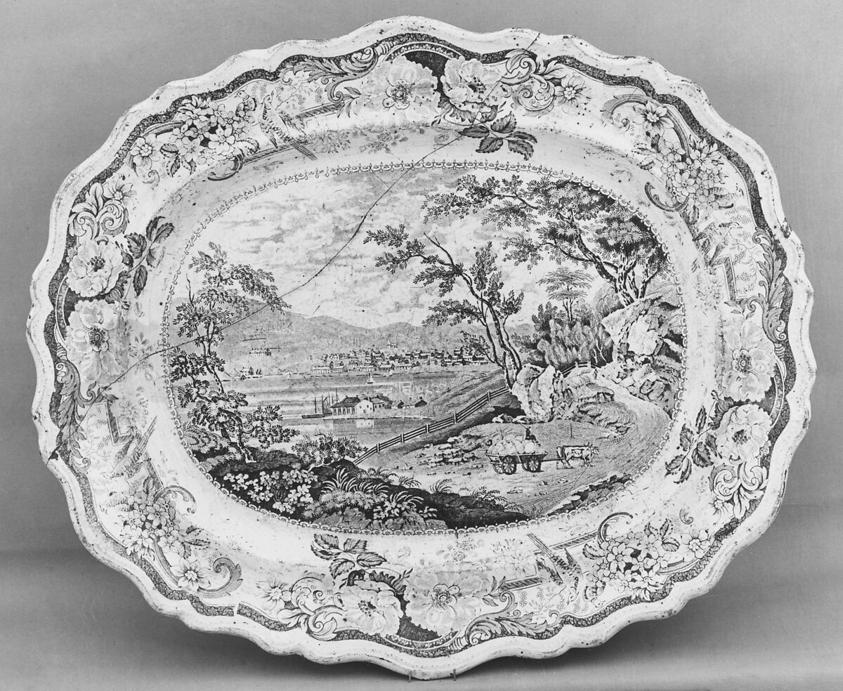 This black and white transfer-printed earthenware plate made by the Staffordshire firm of James & Ralph Clews features a view the historic town of Newburgh, New York located on the Hudson River about ten miles north of West Point and about sixty miles north of the city of New York. Newburgh was an important nineteenth-century river port, furnishing farm-grown produce and other goods to towns and cities down-river. The view on the platter was based on an 1820 watercolor by Irish painter William Guy Wall (1792–after 1863) reproduced by London-born New York engraver John Hill (1770–1850) as an engraving titled "Newburg" in Henry J. Megarey's "Hudson River Portfolio" (New York, 1821–1825). Clews included the view in its series of approximately twenty-three "Picturesque Views" manufactured for the United States export market. The American Wing's collection contains additional pieces by Clews, as well as original works by Wall. Refer to the Dictionary for a definition of the term "transfer printing" and for information about Clews.