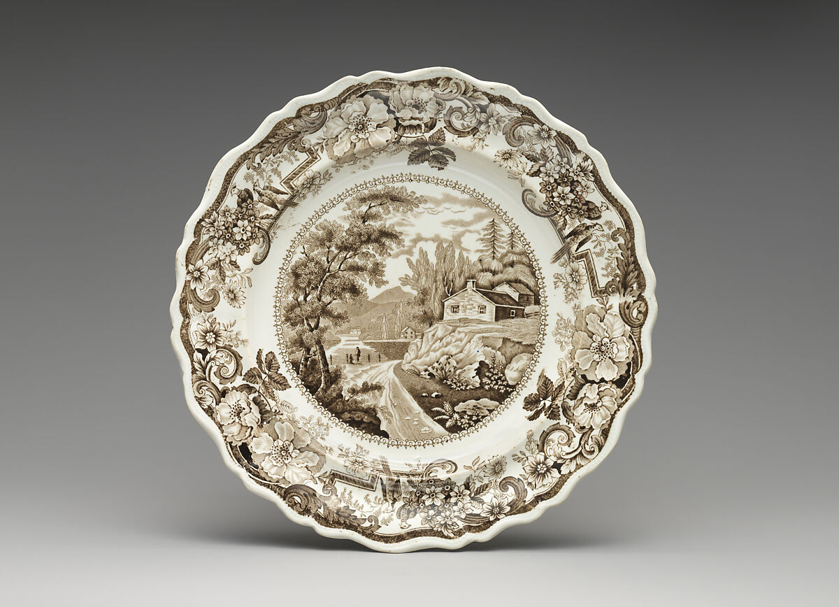 This brown and white transfer-printed earthenware plate made by the Staffordshire firm of James & Ralph Clews features a view of the landing at Fishkill, New York, an historic town on the Hudson River near West Point. The area surrounding Fishkill was admired in the nineteenth century for its scenic hills, including Butter Hill and Beacon Hill rising over one thousand feet above the Hudson. The view by Clews was based on an 1820 watercolor by Irish painter William Guy Wall (1792–after 1864) reproduced by London-born New York engraver John Hill (1770–1850) as an engraving titled "View Near Fishkill" in Henry J. Megarey's "Hudson River Portfolio" (New York, 1821–1825). The same engraving also inspired a view by a competitor of Clews, Enoch Wood & Sons (1818–1846), appearing on a platter, 14.102.102, in the American Wing's collection. Among the finest series of New York State views ever published in the nineteenth century, the "Portfolio” traced the journey of the Hudson River from its headwaters in the Adirondack Mountains to where it joins the East River in New York Bay. Capitalizing on the growth of trade and tourism in the Hudson River region, Clews used nineteen of the twenty views in the "Portfolio" for its series of approximately twenty-three "Picturesque Views” manufactured for the United States export market with borders of flowers, foliage, C-scrolls and exotic birds perched on zigzag meanders. The collection contains additional works by Clews, including others from the same series. It also contains original works by Wall. Refer to the Dictionary for a definition of the term "transfer printing" and for information about the above-mentioned firms.