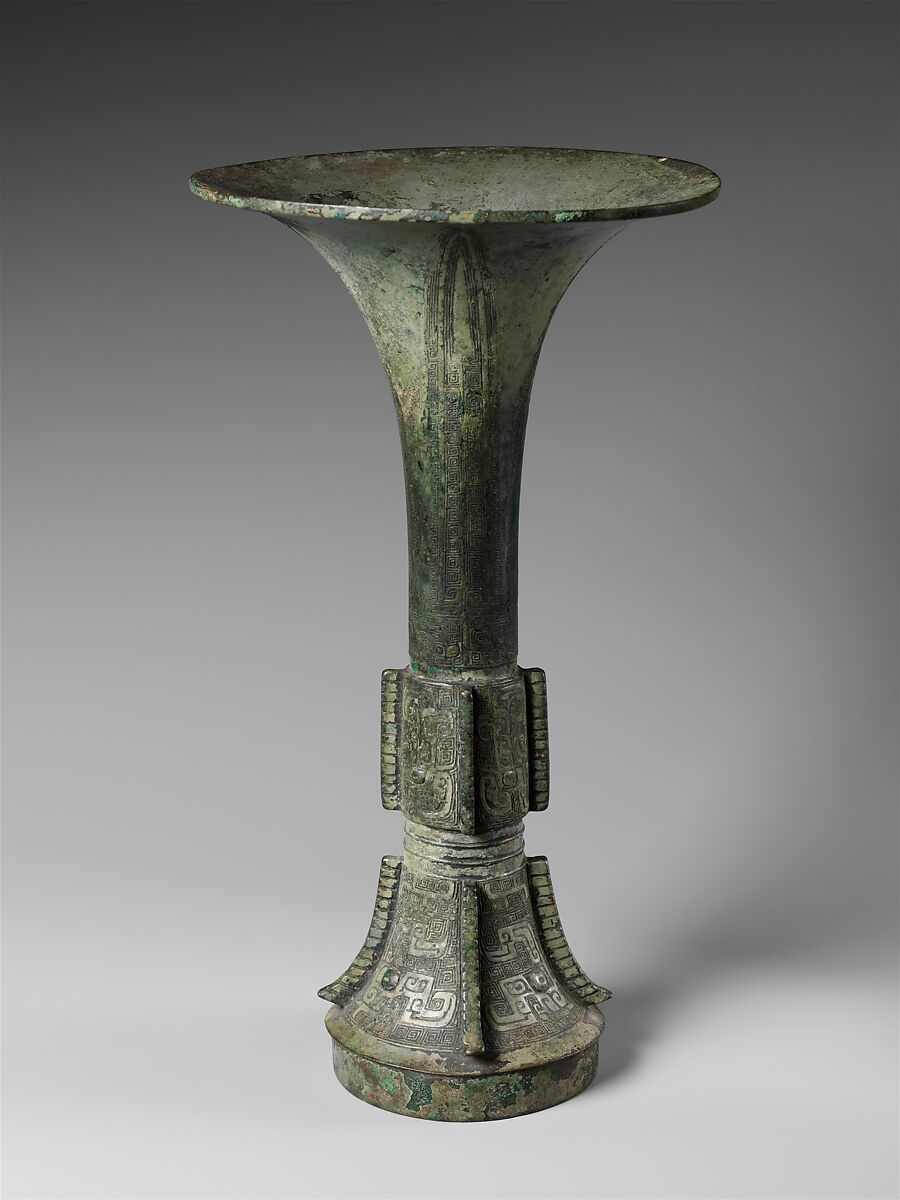 The gu is a type of ritual bronze that was used to drink wine and to offer ritual libations. It has a tall, slender profile with a trumpet-like mouth and a slightly flared base. Below center, there is often a demarcated section with geometric patterns and animal mask (taotie) imagery.