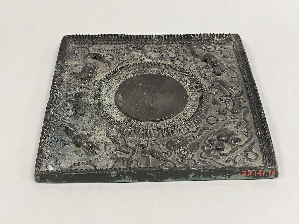 The odd imagery and bogus inscription on this mirror indicate that it is a forgery, but its date is difficult to ascertain. It could be as early as the Ming dynasty or as late as the 19th century.