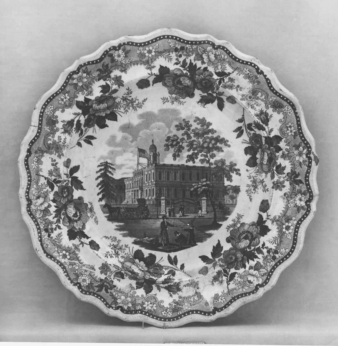 This black and white transfer-printed earthenware plate made by the Staffordshire firm of Job & John Jackson features a view of City Hall in New York near the intersection of Broadway and Park Row. City Hall was designed by New York architect John McComb, Jr. (1765–1853) and French-born New York engineer-architect Joseph Francois Mangin (?–after 1818). Situated on scenic landscaped grounds of City Hall Park, its expansive rusticated Massachusetts marble facade fashioned in an architectural blend of French Renaissance and English Georgian styles distinguished the edifice as one of the most impressive municipal buildings of the era. It was also a popular subject for transfer-printed export wares because of its obvious appeal to civic-minded American consumers. Jackson's view was based on a drawing by English-born artist Charles Burton (active ca. 1819–1842) engraved by Fenner, Sears & Co. and reproduced as "City Hall, New York" in John Howard Hinton's "The History and Topography of the United States of North America" (London, 1830 and 1832). Jackson included the view in its "American Scenery" series consisting of approximately thirty-two American views manufactured for the United States export market with a border of floral bouquets and blossoms, C-scrolls and an outer beaded band. The American Wing's collection contains additional pieces from the same series, as well as original works by Burton. Refer to the Dictionary for a definition of the term “transfer printing" and for information about Jackson.