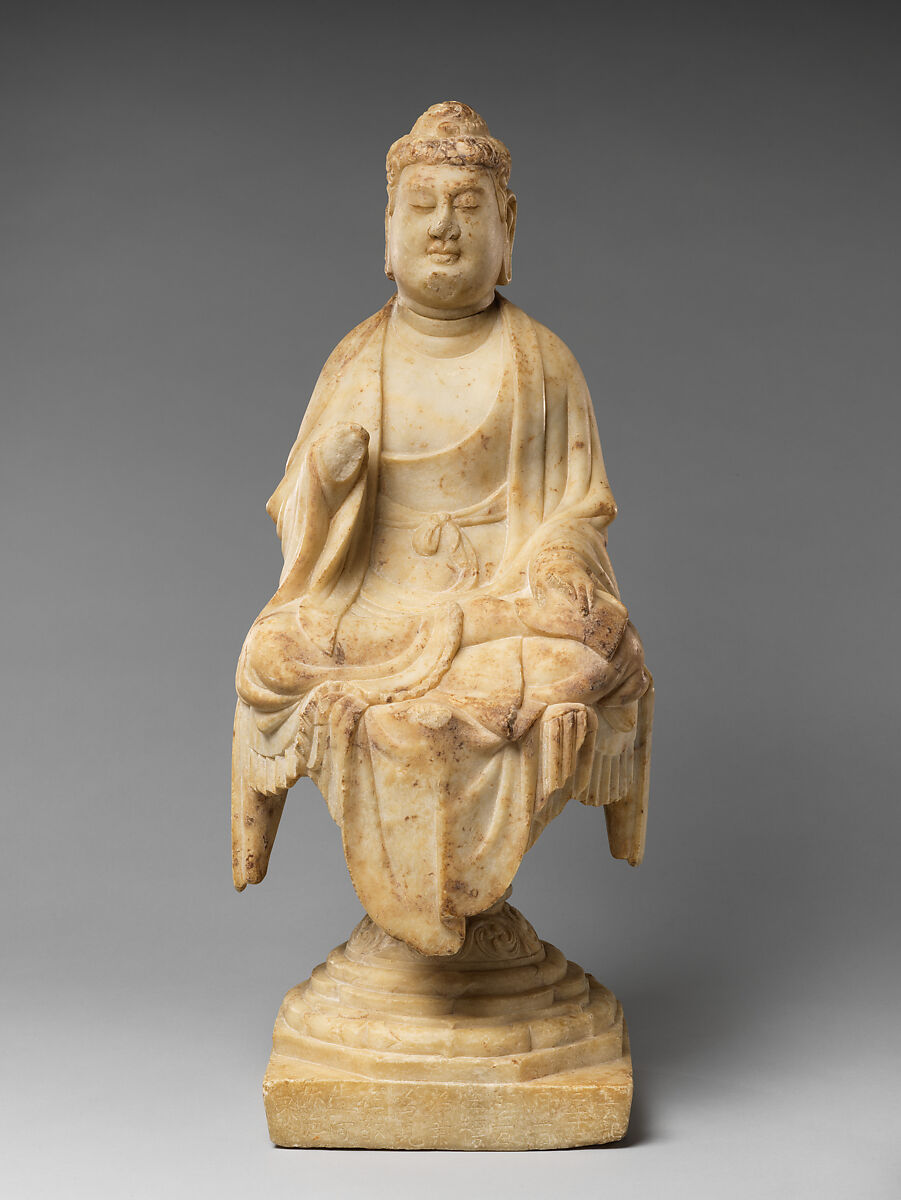 The plumpness of this Buddha’s face and body, together with the draped robes and waisted pedestal, are typical of Chinese sculpture from the late seventh to early eighth century. The inscription on the base identifies the figure as Amitabha, a celestial Buddha who presides over the Western Paradise, but some scholars have suggested that the inscription may have been added later.