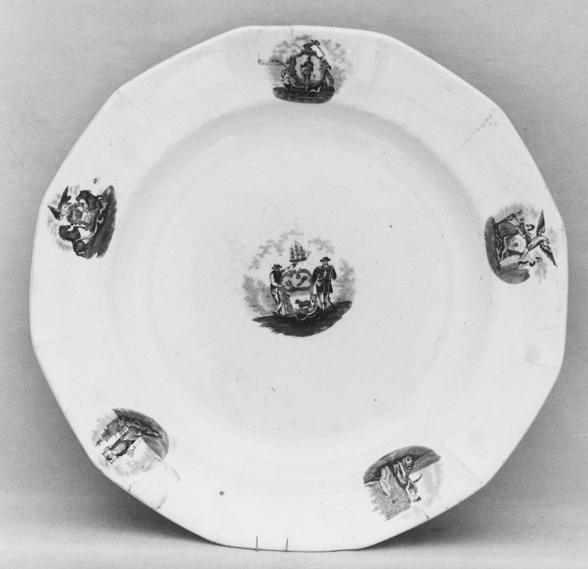 This polychrome transfer-printed earthenware plate made by the Staffordshire firm of Mellor, Venables & Co. features the coat-of-arms of the state of Delaware with the arms of Massachusetts, New York, North Carolina, Pennsylvania and Virginia along the border. The central Delaware arms consists of a shield flanked by a sailor and hunter. The design belongs to a series of eight designs produced for the United States export market displaying the arms of Delaware, Maryland, Massachusetts, Mississippi, New York, North Carolina, Pennsylvania and Virginia individually in the center. Designs from the series are found in either polychrome or monochrome. To create a polychrome effect a design was first printed in a single color and then filled in with multi-colored highlights. The present plate, for example, was printed in brown and then filled in with pink, yellow and red. Monochrome pieces typically feature intentionally blurred or "flown" prints. The series also features two different borders. The standard border for polychrome pieces includes the arms of the eight states in varying combinations and quantities such as the present plate with a border of five arms. The standard border for monochrome pieces consists of a thin flown circle around the rim. Plates from the series are fourteen-sided with paneled rims. Holloware table forms such as teapots have paneled sides as well. States' arms were a popular way for Staffordshire potters to cater the American export market. Additional examples in the American Wing's collection include two plates, 14.102.34 and 14.102.156, by Thomas Mayer (ca. 1826–1838). Refer to the Dictionary for a definition of the term "transfer printing" and for information about Mellor and Mayer.