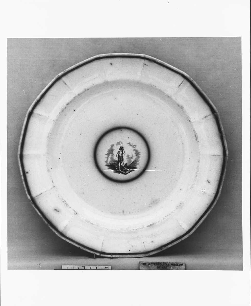 This black and white and flow-blue transfer-printed earthenware plate made by the Staffordshire firm of Mellor, Venables & Co. features the coat-of-arms of the State of Virginia. It belongs to a series produced for the United States export market displaying the arms of Delaware, Maryland, Massachussetts, Mississippi, Pennsylvania and Virginia in various combinations. Plates in the series like this example are fourteen-sided with panelled rims. Some have borders with miniature coats-of-arms, while others like this plate have only a thin flow blue circle around the edge. Refer to the Dictionary for a definition of the term "transfer printing" and for information about Mellor, Venables & Co.