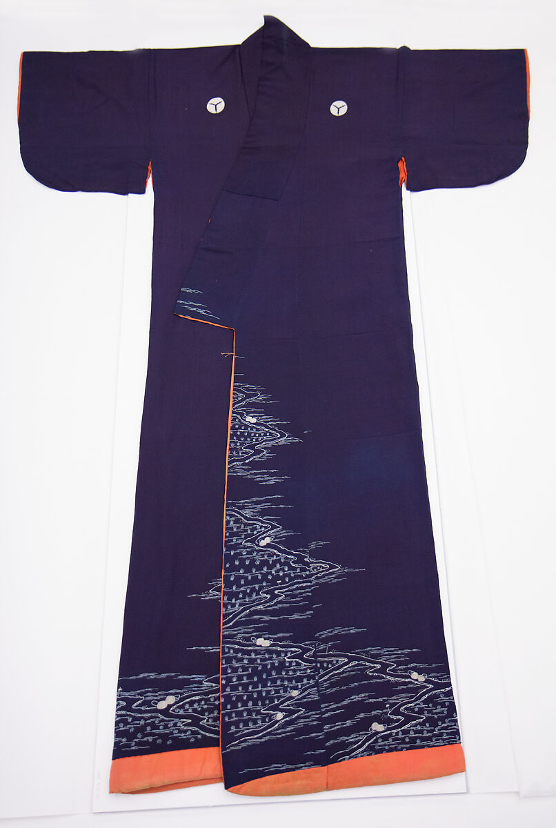 This robe exemplifies the late Edo period’s minimalist aesthetic in fashion, characterized by simple "white-reserve” (shiro-age) patterns on a monochrome ground. The compositions were rendered in paste, which would resist the dye subsequently applied to the white fabric. Here, the resulting rural landscape features newly planted, spring rice fields, the paths between them dotted with baskets embellished in ink by hand. Because rice cultivation has long played an essential role in Japanese culture, the paddies where the crop is grown are a frequent subject in art and often symbolize Japanese identity.