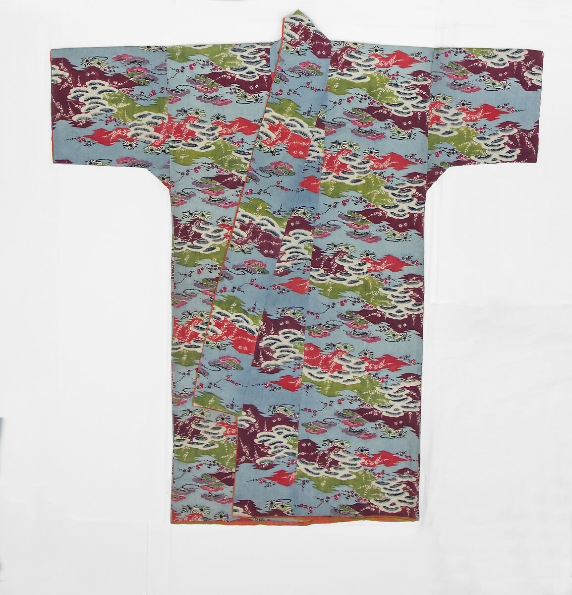 This costume features a pattern of pine boughs and plum blossoms, common throughout east Asia, on a background of colorful broken-diamond shapes, a traditional Japanese pattern called matsukawabishi (pine-bark lozenges) for its fundamental resemblance to pine bark. Note that there are two views of pine boughs in the design: one is a cloud-shaped view of the side of a large limb, and the other is a view of the end of a branch in the form of a circle with radiating pine needles.