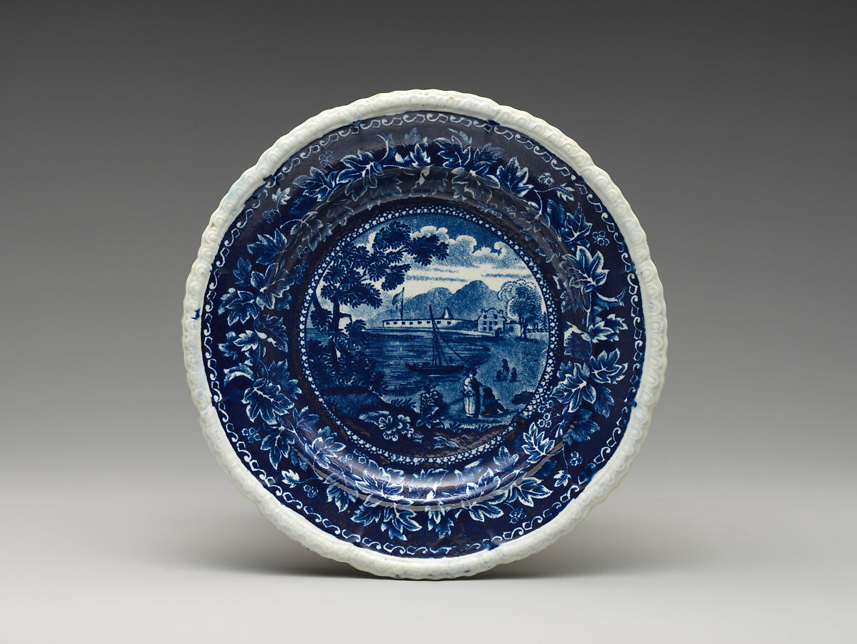 This blue and white transfer-printed earthenware plate made by the Staffordshire firm of Ralph Stevenson features a view of Fort Gansevoort in New York. The view belongs to a series of approximately twenty-two views of American cities and buildings with a standard vine-leaf border produced for the United States export market. Fort Gansevoort was erected in 1812 on the Hudson River on Manhattan Island near the intersection of Little West Twelfth Street and Tenth Avenue as a naval fortification for the city's defense during the War of 1812. Officially named in honor of American Revolutionary General Peter Gansevoort (1749–1812) the fort was commonly referred to as the "White Fort" because of its white-washed exterior. It was torn down sometime before 1849. Symbolic of the young nation's military power, fortifications were popular subjects for transfer-printed export wares. Other examples include New York's Castle Garden pictured on a Stevenson pitcher, 98.1.8, and a plate, 14.102.288, by James & Ralph Clews (ca. 1815–1834). Stevenson's view of Fort Gansevoort was based on an engraving published in about 1830 after a drawing by English-born New York artist Charles Burton (active ca. 1819–1842). Engravings after Burton drawings also inspired views on other pieces in the collection, including another Stevenson plate, 14.102.7, and two plates, 14.102.261 and 14.102.301, by Job & John Jackson (1831–1835). The collection also contains additional pieces by Stevenson and original works by Burton. Refer to the Dictionary for a definition of the term "transfer printing" and for information about Stevenson and the other above-mentioned firms.