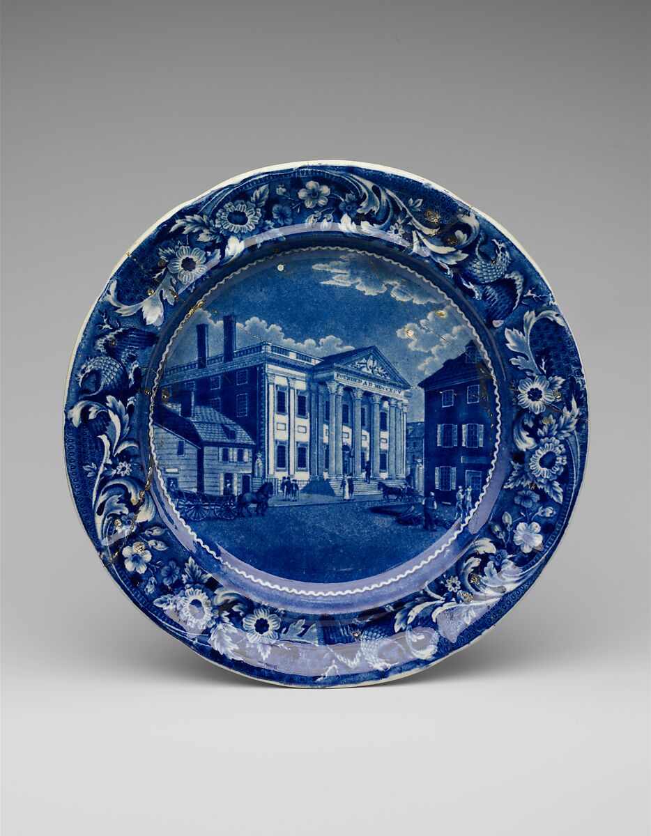 This blue and white transfer-printed earthenware plate made by the Staffordshire firm of Joseph Stubbs features a view of the Bank of the United States located at 116 South Third Street in Philadelphia, Pennsylvania. The bank was built from 1795 to 1797 after designs by Philadelphia architect Samuel Blodgett, Jr. (1757–1814) for use as the first federal bank of the United States. It is the oldest bank building in America.