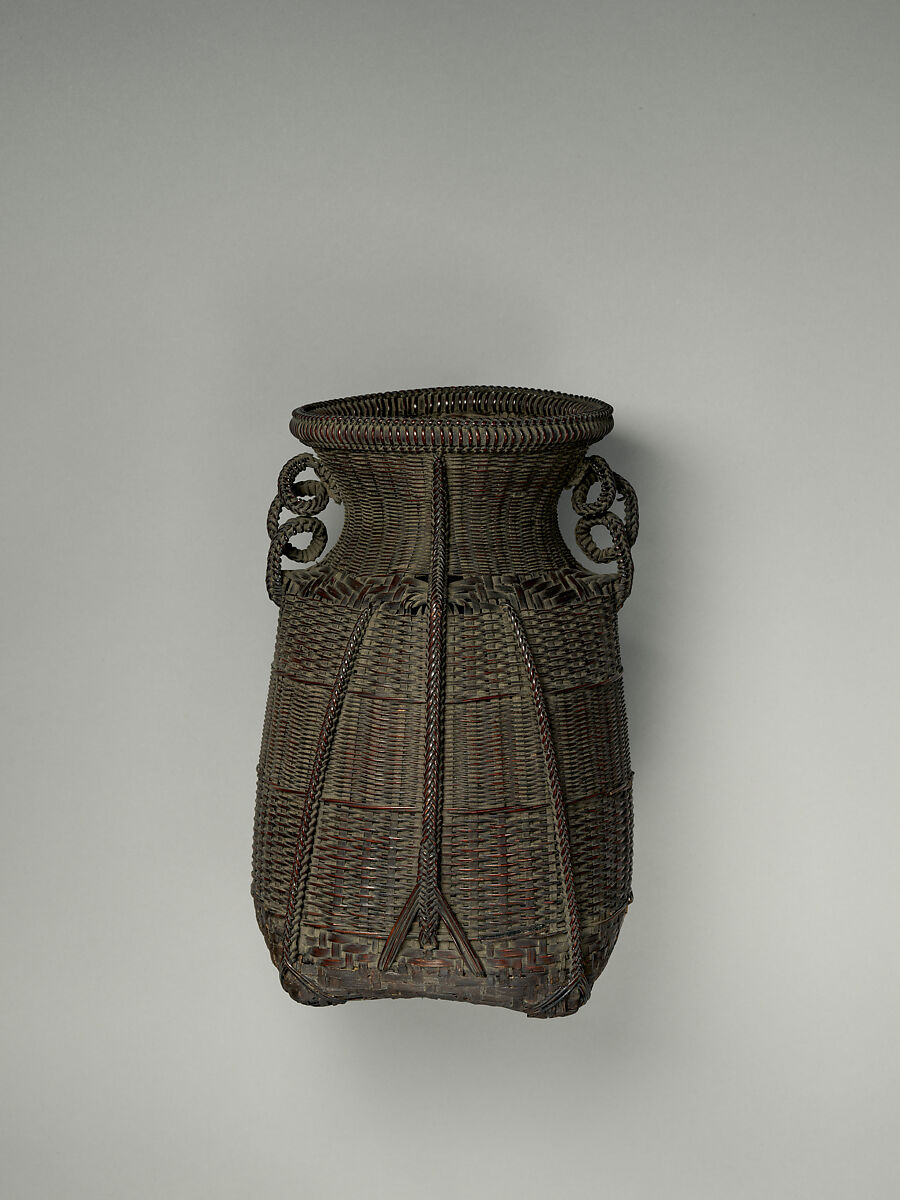 For hundreds of years, Japanese farmers and craftspeople harvested bamboo, processed it, and plaited fine strips into practical vessels. Some of these were used in the Japanese art of flower arrangement, ikebana. The nineteenth century saw the rapid growth of basketry inspired by the popular sencha (steeped) tea culture in the Osaka-Kyoto area, and master craftspeople made Chinese-style works such as this flower basket.