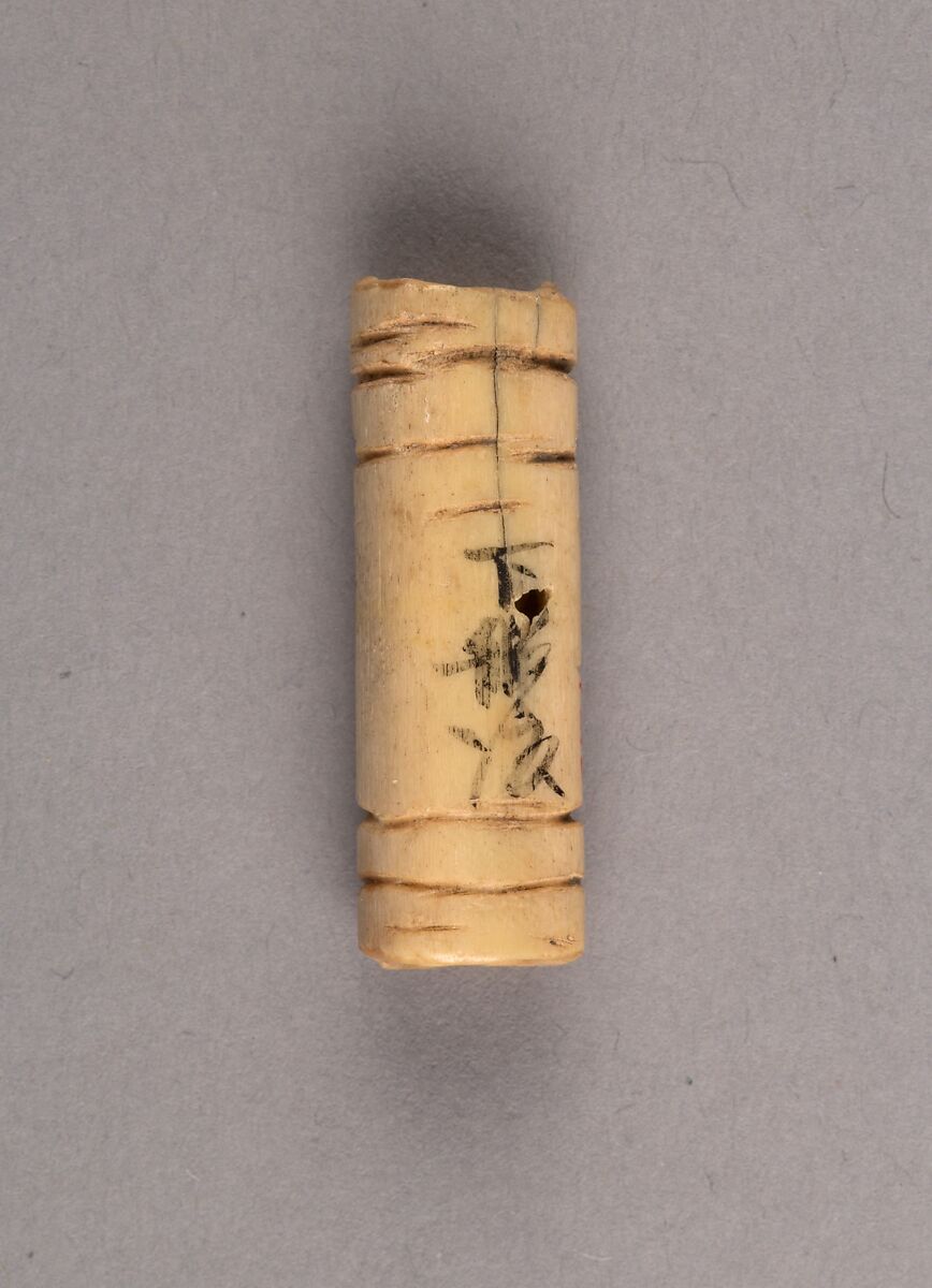 This object is from a large collection of various implements—fishhooks, needles, and harpoons—that were carved from bone, a material worked by Japanese artisans since Paleolithic times. They were found in the Ōhora shell midden (Ōhora kaizuka 大洞貝塚)near Ōfunato Bay, Iwate Prefecture, in the Tōhoku region of northern Japan. According to information gleaned from shell mounds, or middens, the people of the Jōmon period relied on a variety of strategies to obtain food. The large number of fishhooks, fashioned with and without barbs, together with the rich array of marine remains found in these rubbish heaps since very early times indicate that some fifty species of fish and shellfish constituted an essential dietary staple. Toggle-head harpoons, a later innovation, facilitated the hunting of sea mammals. Attaching a line to the toggle allowed the hunter to draw in his prey once the toggle had broken away from the harpoon shaft. Further evidence gathered from these refuse dumps suggests that the Jōmon people also relied heavily on nuts, collected most actively in the autumn, and hunted animals, notably wild boar and deer.