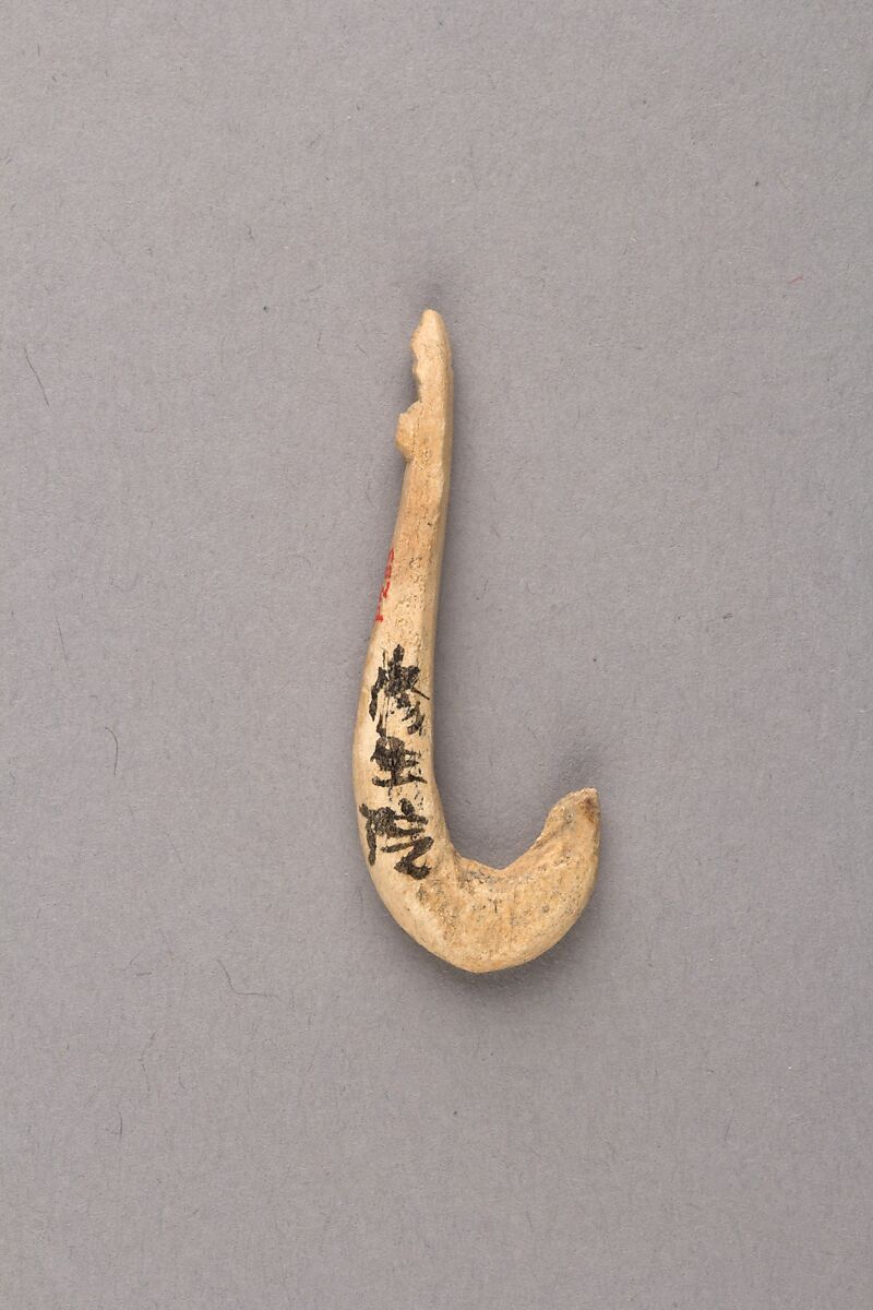 The Jōmon period is the earliest period in Japanese history, lasting from roughly 14,000 to 300 BCE. The Jōmon people were primarily hunter-gatherers, hunting land animals and gathering vegetables and nuts on the land as well as hunting and fishing at sea. Using implements such as this fishhook, Jōmon communities, especially those close to the sea, were able to consume a variety of fish. Fish bones found at Jōmon archaeological sites indicate that the Jōmon hunted fish not only close to the shore but also farther out in the open sea, where larger fish such as tuna could be caught. There is even evidence that the Jōmon ate pufferfish, a poisonous fish considered a delicacy in modern Japan.