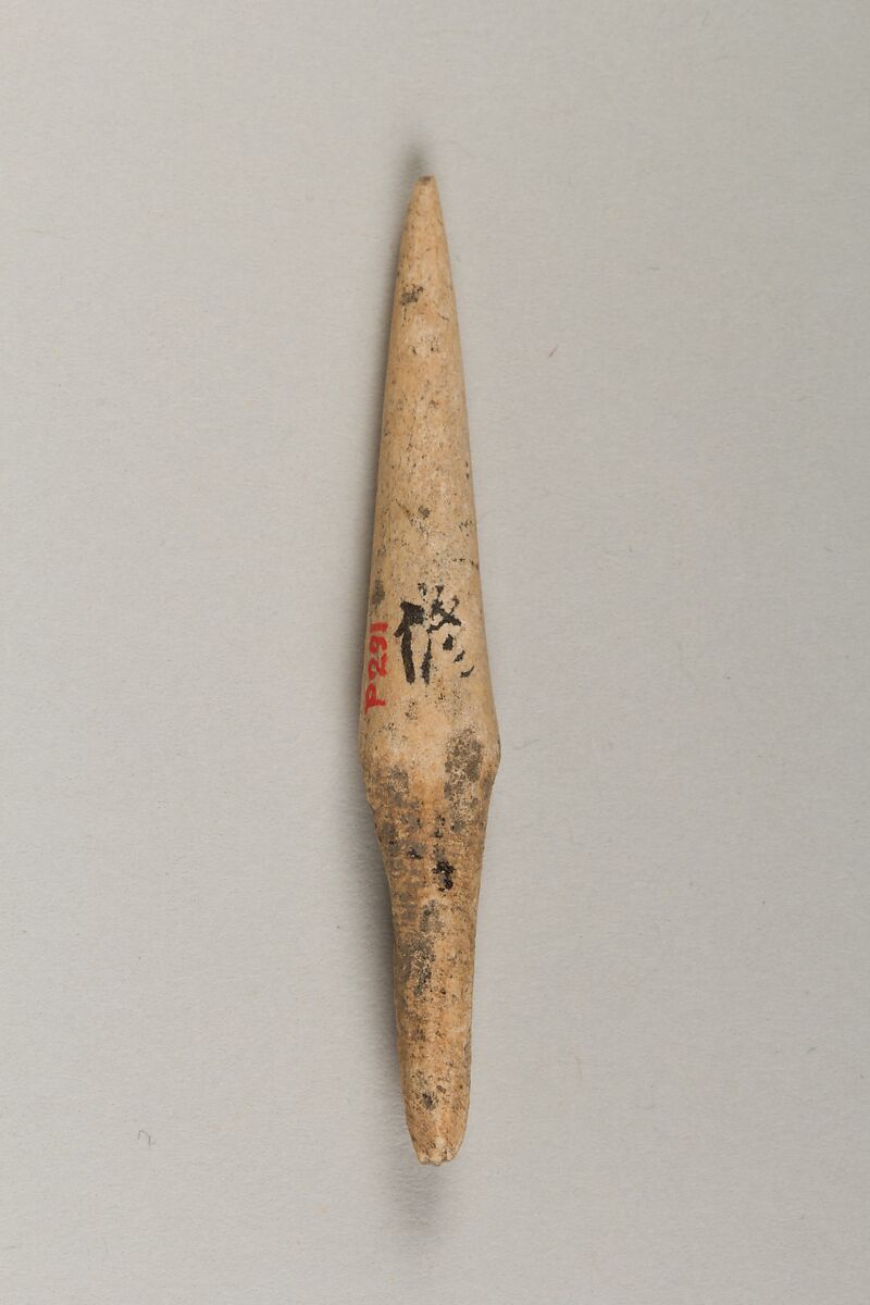 The Jōmon period is the earliest period in Japanese history, lasting from roughly 14,000 to 300 BCE. The Jōmon people were primarily hunter-gatherers, hunting land animals and gathering vegetables and nuts on the land as well as hunting and fishing at sea. Harpoon heads such as this one testify to the importance of seafood in the diets of some Jōmon communities, especially those close to the sea. Fish bones found at Jōmon archaeological sites indicate that the Jōmon hunted fish not only close to the shore but also farther out in the open sea, where larger fish could be caught. There is even evidence that the Jōmon ate pufferfish, a poisonous fish considered a delicacy in modern Japan.