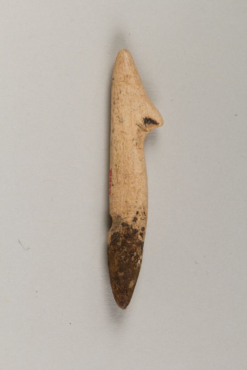 The Jōmon period is the earliest period in Japanese history, lasting from roughly 14,000 to 300 BCE. The Jōmon people were primarily hunter-gatherers, hunting land animals and gathering vegetables and nuts on the land as well as hunting and fishing at sea. Harpoon heads such as this one testify to the importance of seafood in the diets of some Jōmon communities, especially those close to the sea. Fish bones found at Jōmon archaeological sites indicate that the Jōmon hunted fish not only close to the shore but also farther out in the open sea, where larger fish could be caught. There is even evidence that the Jōmon ate pufferfish, a poisonous fish considered a delicacy in modern Japan.