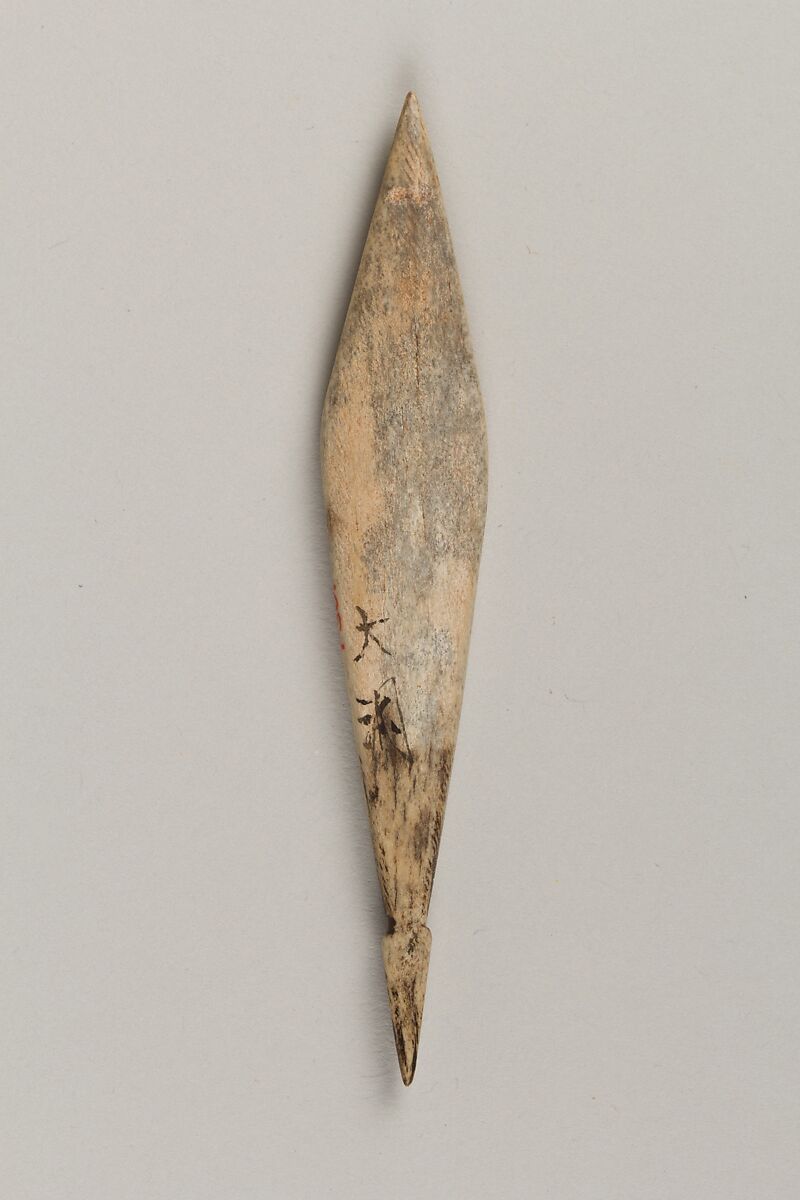 The Jōmon period is the earliest period in Japanese history, lasting from roughly 14,000 to 300 BCE. The Jōmon people were primarily hunter-gatherers, hunting land animals and gathering vegetables and nuts on the land as well as hunting and fishing at sea. Harpoon heads such as this one testify to the importance of seafood in the diets of some Jōmon communities, especially those close to the sea. Fish bones found at Jōmon archaeological sites indicate that the Jōmon hunted fish not only close to the shore but also farther out in the open sea, where larger fish could be caught. There is even evidence that the Jōmon ate pufferfish, a poisonous fish considered a delicacy in modern Japan.