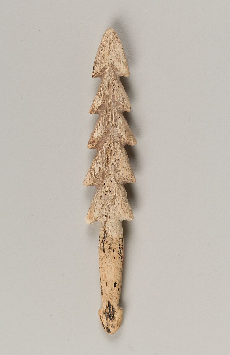 The Jōmon period is the earliest period in Japanese history, lasting from roughly 14,000 to 300 BCE. The Jōmon people were primarily hunter-gatherers, hunting land animals and gathering vegetables and nuts on the land as well as hunting and fishing at sea. Harpoon heads such as this one testify to the importance of seafood in the diets of some Jōmon communities, especially those close to the sea. Fish bones found at Jōmon archaeological sites indicate that the Jōmon hunted fish not only close to the shore but also farther out in the open sea, where larger fish could be caught. There is even evidence that the Jōmon ate pufferfish, a poisonous fish considered a delicacy in modern Japan.