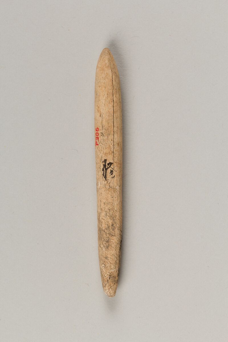 The Jōmon period is the earliest period in Japanese history, lasting from roughly 14,000 to 300 BCE. The Jōmon people were primarily hunter-gatherers, hunting land animals and gathering vegetables and nuts on the land as well as hunting and fishing at sea. Harpoon heads such as this one testify to the importance of seafood in the diets of some Jōmon communities, especially those close to the sea. Fish bones found at Jōmon archaeological sites indicate that the Jōmon hunted fish not only close to the shore but also farther out in the open sea, where larger fish could be caught. There is even evidence that the Jōmon ate pufferfish, a poisonous fish considered a delicacy in modern Japan.