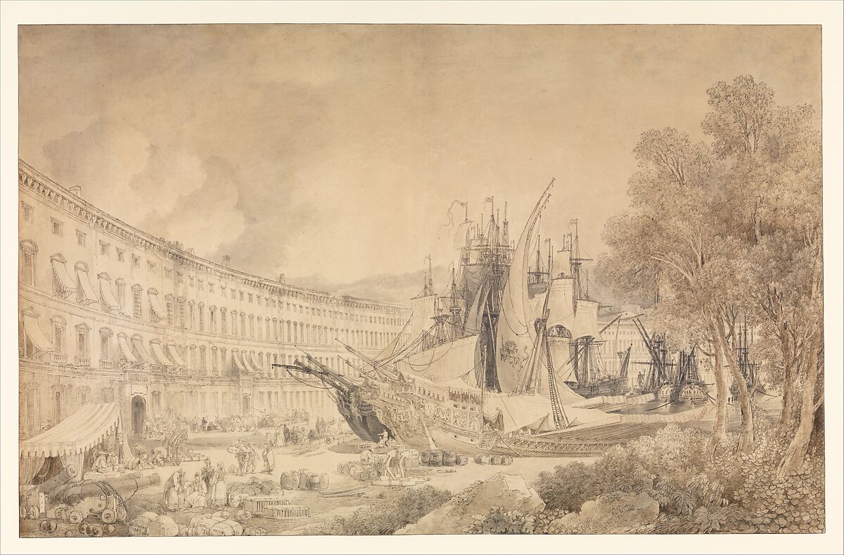Although no studies for the Metropolitan’s drawing have survived, Cassas’s working method was similar to Desprez’s in that he first made plein air studies and then created his large, highly finished drawings in the studio, leaving us to speculate on which parts of his composition reflect empirical reality and which constitute embellishments. Clearly, based on centuries of drawings and maps, we can be certain that the repoussoir of beautifully delineated trees and foliage at the right edge of the composition sprang from Cassas’s imagination, either out of a need for balance or a sense of whimsy. As for the boats, so precisely rendered in their ornament and functional detail, their degree of realism is more difficult to judge. Densely layered in a foreshortened space, they offer a tempting level of specificity. One the galleons displays atop its main mast what appears to be a British union flag, while the sail of the second galley is decorated with a lion bearing a book and a sword, possibly referring to the flag of Venice. Other details are puzzling: why are a number of the sails unfurled, even catching wind, when boats at port should have their sails rolled and tied? Moreover, would galleys still have been in use in the 1780s? Certainly, their heyday had passed, although they were important symbols for the city of Messina, and an ephemeral galley was built in the fountain in the Square of St. John of Malta every year in early August for the feast of the Assumption of St. Mary, from which fireworks would be set off. The two canons Cassas included at lower left also recall the port’s historic military importance.