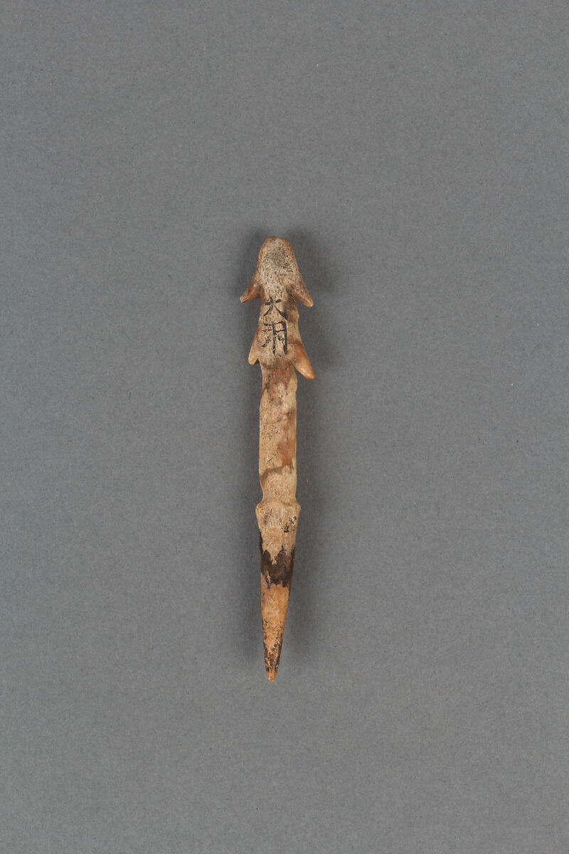 The Jōmon period is the earliest period in Japanese history, lasting from roughly 14,000 to 300 BCE. The Jōmon people were primarily hunter-gatherers, hunting land animals and gathering vegetables and nuts on the land as well as hunting and fishing at sea. Harpoon heads such as this one testify to the importance of seafood in the diets of some Jōmon communities, especially those close to the sea. Fish bones found at Jōmon archaeological sites indicate that the Jōmon hunted fish not only close to the shore but also farther out in the open sea, where larger fish could be caught. There is even evidence that the Jōmon ate pufferfish, a poisonous fish considered a delicacy in modern Japan.