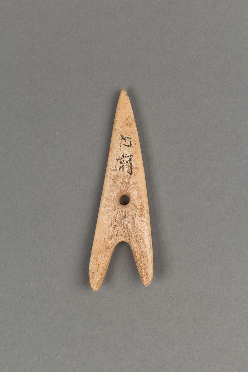 The Jōmon period is the earliest period in Japanese history, lasting from roughly 14,000 to 300 BCE. The Jōmon people were primarily hunter-gatherers, using arrowheads such as this one to hunt a variety of land animals. Archaeological evidence indicates that the Jōmon hunted over 60 species of mammal throughout the Japanese archipelago, including tanuki (Japanese raccoon dogs) and monkeys, both of which would likely be considered unpalatable in contemporary Japanese society.