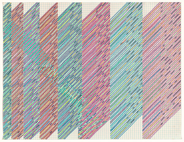 Sharits’s earlier experiments with flicker films—in which rapidly alternating black, white, or colored frames appear to pulse on screen—informed this hallucinatory yet diagrammatic drawing. Cellular Disorder 10 is designed to conduct spectral analysis by diffracting light into systems of densely packed multicolored lines. Due to the interplay between warm and cool colors, this drawing produces unpredictable patterns that seem to vibrate frenetically.