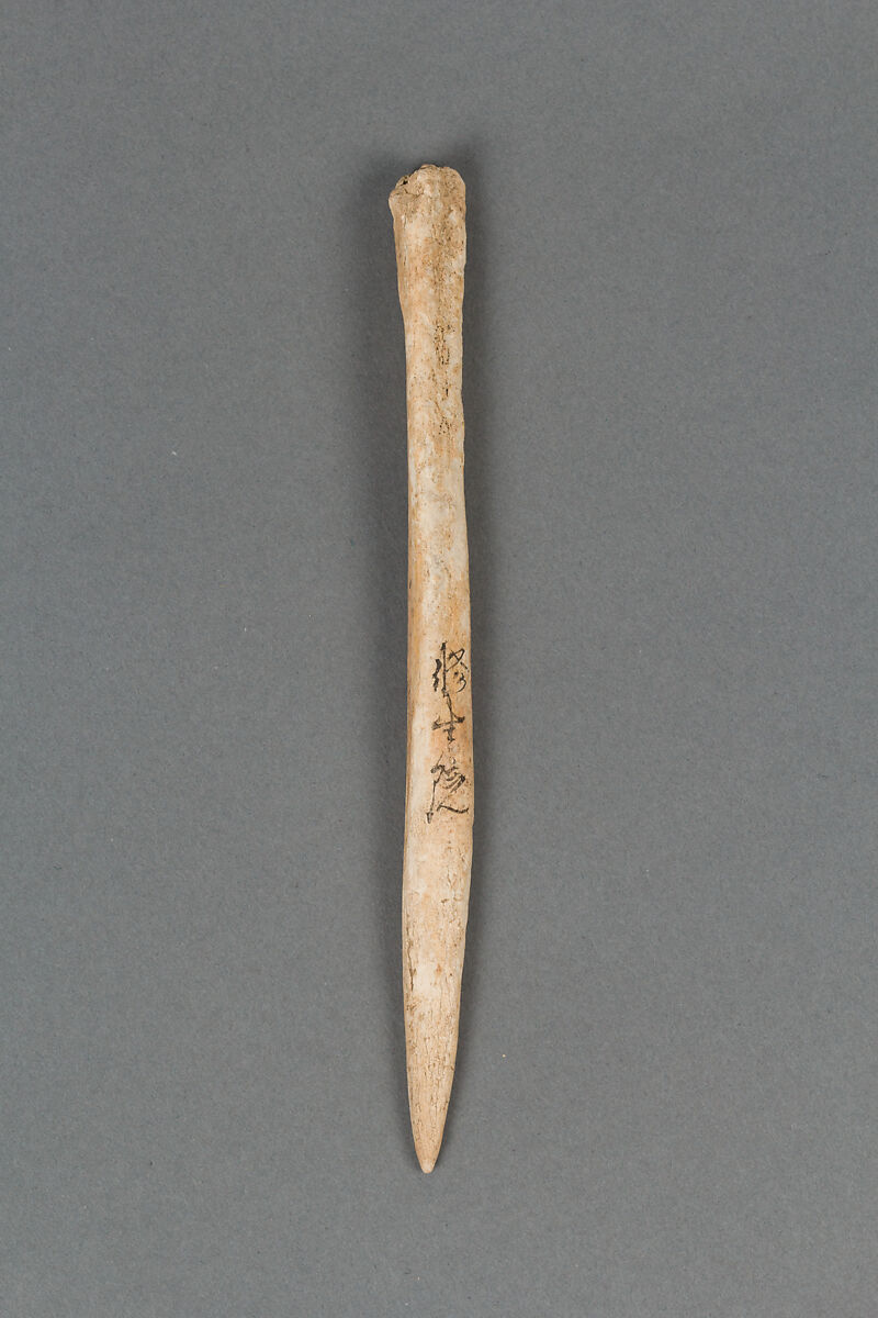 The Jōmon period is the earliest period in Japanese history, lasting from roughly 14,000 to 300 BCE. The Jōmon people were primarily hunter-gatherers, hunting land animals and gathering vegetables and nuts on the land as well as hunting and fishing at sea. Harpoon heads such as this one testify to the importance of seafood in the diets of some Jōmon communities, especially those close to the sea. Fish bones found at Jōmon archaeological sites indicate that the Jōmon hunted fish not only close to the shore but also farther out in the open sea, where larger fish could be caught. There is even evidence that the Jōmon ate pufferfish, a poisonous fish considered a delicacy in modern Japan.