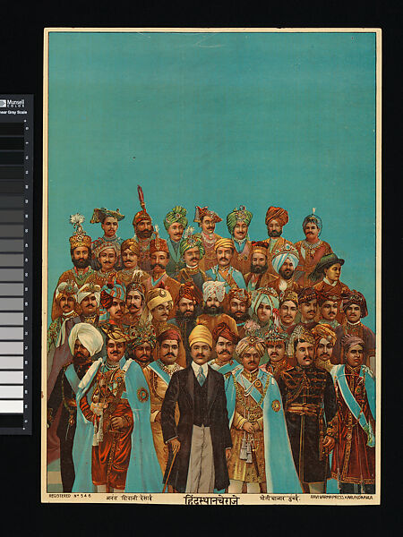 This print gathers together the Maharajas of the day and assembles them into a fictional group portrait. Drawing on photographs, this assembled montage has an appealing veracity not seen in earlier lithographs. As these Maharajas were well known figures they would have been known to the audience of this print.