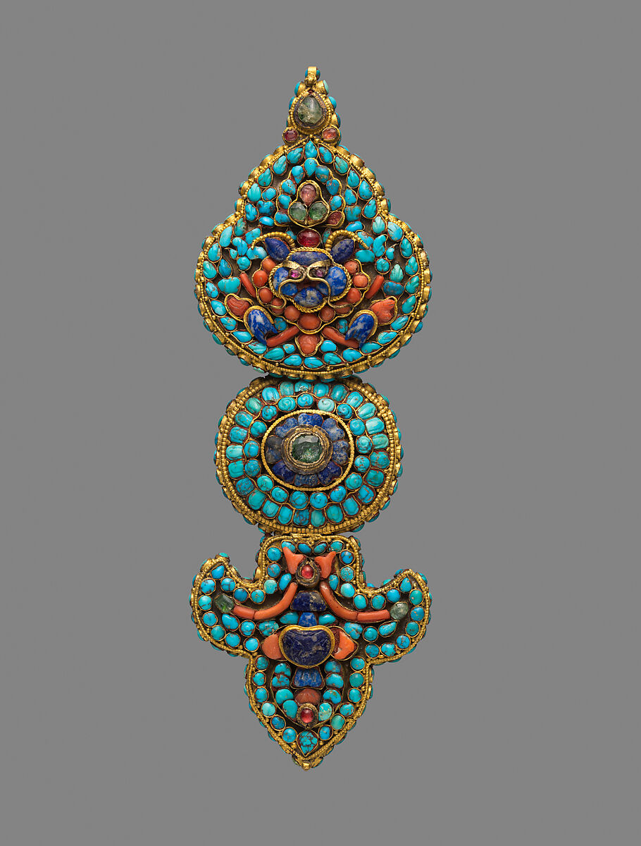 - Medium: Gold, coral, shell, and turquoise