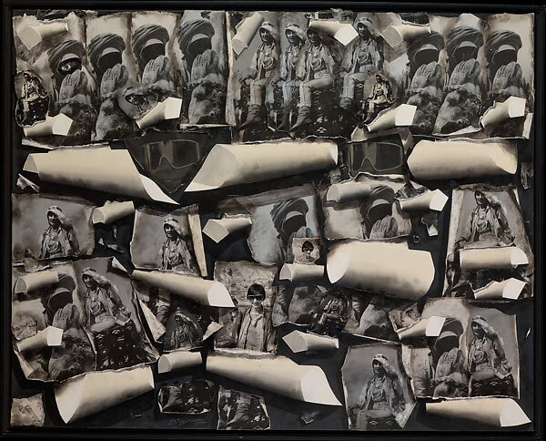 Through repetition and the play of size and orientation, the persons and details in the photographs are hard to recognize and the photographs lose their realistic value and three-dimensionality. The cones, even though flat, appear as if they would stand out from the piece and create a sculptural texture to the work, while the technique of fumage applied over the photographs and the cones creates dark zones or shadows.