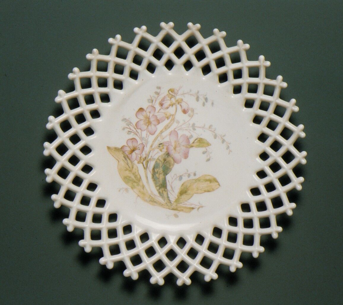 This plate is an example of the Victorian taste for decorated opaque white glass. Both the shape and the decoration appear in an 1891 illustrated catalogue of Challinor, Taylor and Company, Limited. The specific reference is important because milk glass plates in this shape but with different center designs were reproduced by the Westmoreland Glass Company in the twentieth century. The floral design on this plate was transfer printed in red outline, then hand colored. This forms a pair with 1982.325.2, each plate having a different central floral motif.
