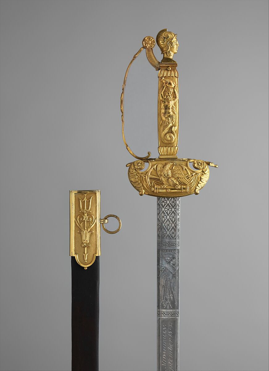 This sword is considered the finest example, in terms of condition and completeness, among the eight swords known to survive from a group of approximately twenty-seven that were commissioned by Congress during the War of 1812 for presentation to junior warrant officers (sailing masters and midshipmen) who took part in the Battle of Lake Erie on September 10, 1813. While many nineteenth-century presentation swords in both the United States and Europe follow conventional patterns and forms, this hilt combines classical elements, nautical motifs, and patriotic emblems to create a completely original design that was used only for these 1812 Congressional presentation swords. It is thought that the hilt design was created by one of the diesinkers at the US Mint in Philadelphia, which may account for its innovative and nontraditional appearance. In addition to the remarkable condition of the hilt and scabbard fittings, the sword is also particularly notable for its finely preserved blade, which retains its original polish and delicate etched decoration on a frosted ground. The sword was presented to midshipman Peleg K. Dunham (1794–1822), a nineteen-year-old serving on the USS Caledonia during the Battle of Lake Erie, and has remained in the family of his descendants from that time until it entered the Museum's collections. It forms an appropriate pendant to another War of 1812 sword in the Metropolitan Museum's collection (acc. no. 22.19a, b), which was presented posthumously by the state of New York to Brigadier General Daniel Davis (1777–1814) for his actions at the Battle of Fort Erie in 1814.