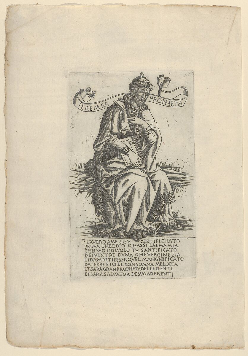 This print is part of a series comprised of twenty-four Prophets and twelve Sibyls, modeled after the series of the same subject by Baccio Baldini (TIB 2403.052-.089). Rosselli's engravings are executed in the Broad Manner and Italianate in style, whereas Baldini's are in the Fine Manner and mostly Germanic in style. Rosselli's prints vary from faithful ciopies of Baldini's prints to loose adapations. This print is copied from Baccio Baldini's Prophet Jeremiah (TIB 2403.069).
