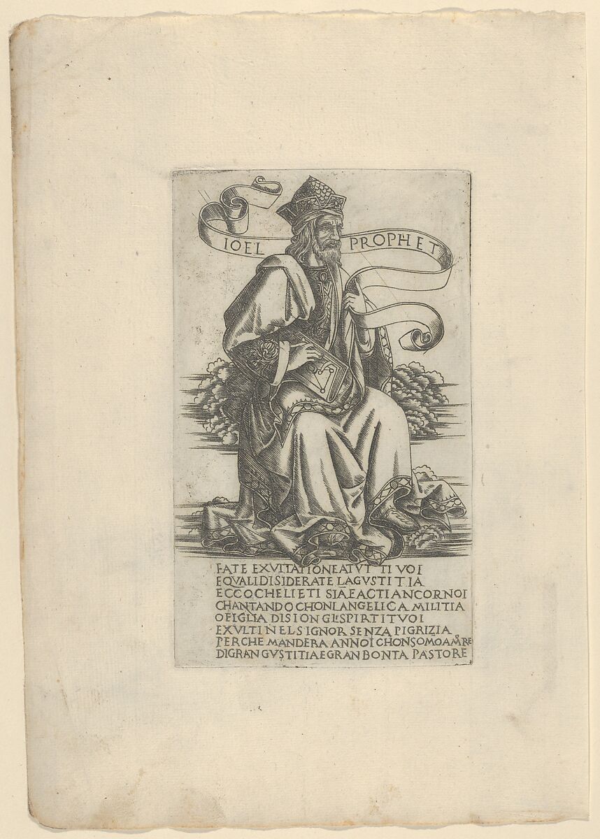 This print is part of a series comprised of twenty-four Prophets and twelve Sibyls, modeled after the series of the same subject by Baccio Baldini (TIB 2403.052-.089). Rosselli's engravings are executed in the Broad Manner and Italianate in style, whereas Baldini's are in the Fine Manner and mostly Germanic in style. Rosselli's prints vary from faithful ciopies of Baldini's prints to loose adapations. This print is copied from Baccio Baldini's Prophet Joel (TIB 2403.065).
