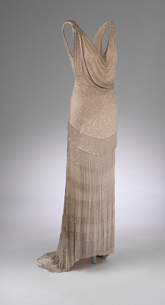 The House of Worth saw business decline in the early years of the twentieth century, as it lost favor among a younger clientele. The house began to advertise for the first time in the 1920s, calling attention not only to its distinguished heritage but also to its ability to create modern, youthful designs. This dress demonstrates designer Jean-Charles Worth’s talent for embracing a modern aesthetic and silhouette while honoring the tradition of refined workmanship on which the house had built its reputation. Composed of silk tulle, the gown is densely embroidered with silver glass bugle beads that extend into deep layers of fringe and are worked into intricate braids at the shoulders. That the dress has survived is remarkable, given the fragility of the materials used in its composition.