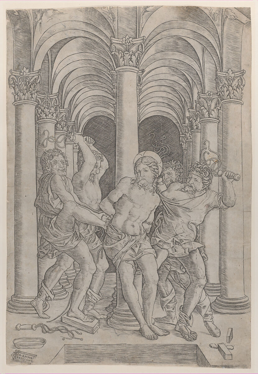 - Title: The Flagellation of Christ who is tied to a column at center set within an arcade