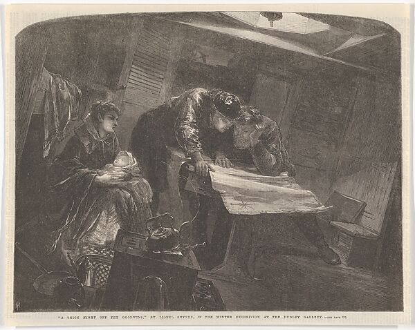 This print shows a sailor in wet weather gear and bearded companion intensely studying a chart below decks, as a woman nurses a baby and a kettle tips dangerously on a stove--the Goodwins are dangerous shoals off the east coast of Kent. Smythe, a painter of landscape and rustic genre had begun exhibiting at the Royal Academy in 1863 and Jackson's wood engraving reproduces a work he showed there in 1869. The subject had been suggested by an article in the periodical "Household Words." As he worked out the composition, Smythe consulted with his stepbrother, the marine painter William Lionel Wyllie, made studies in a schooner on the Thames, and had a sloping platform constructed in his family's house in London. Smythe's watercolor version of the subject is now at the National Maritime Museum, Greenwich.