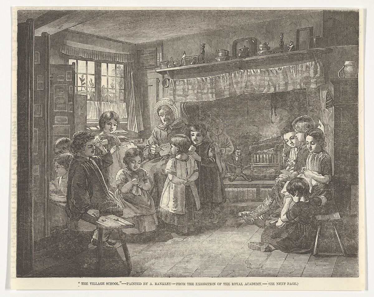 An elderly woman teaches children near an open hearth (an example of the "dame schools" that offered poor British children rudimentary education in the 19th century). In the 1850s Rankley turned from exhibiting elevated literary subjects to focus on genre themes centered on children and education. The painting on which this print is based was shown at the Royal Academy of Arts, London in 1856 and the wood engraving appeared in the "Illustrated London News" shortly afterward.