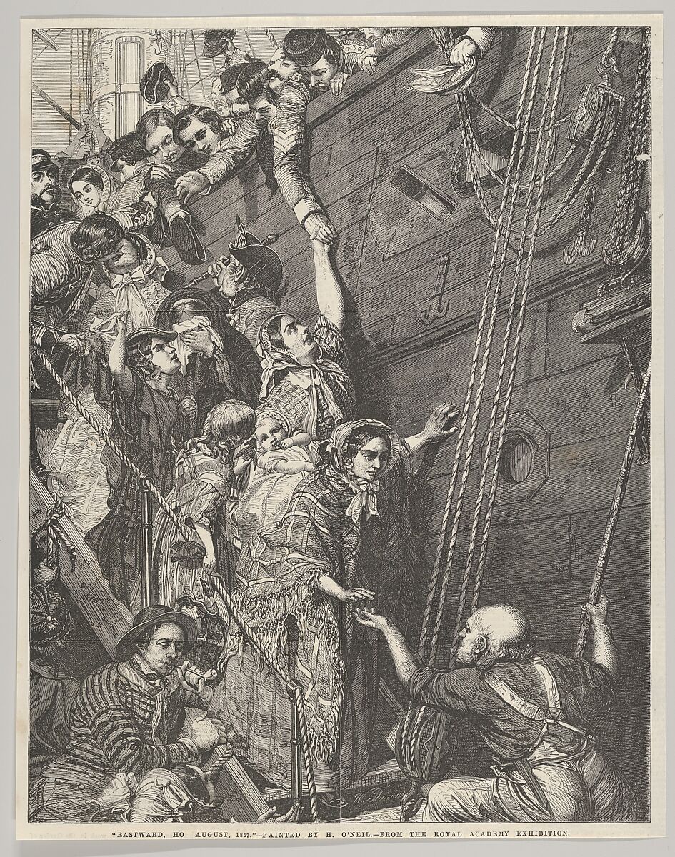 Published in the "Illustrated London News," this wood engraving shows British soldiers bidding farewell to family, sweethearts and friends as their ship departs for Calcutta—headed towards the Indian "Mutiny" (or Indian First War of Independence, 1857–59). Thomas's wood engraving reproduces an 1858 painting (now at Elton Hall) that propelled O'Neil to public prominence--after being shown at the Royal Academy in 1858, the work toured Britain and was seen by over half a million people. The interwoven bodies and linked hands suggest a range of relationships and anticipate the pending separation as visitors move down the steep steps.