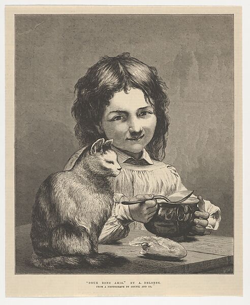 The good friends of the title are a boy and his cat sharing a drink from the same cup. The British printmaker Hollidge produced this wood engraving after a painting by the French artist Delobbe for London's weekly journal "Illustrated London News." In 1875, Delobbe began to spend summers at the artists's colony at Concarneau in Brittany and focused on children and peasant subjects.