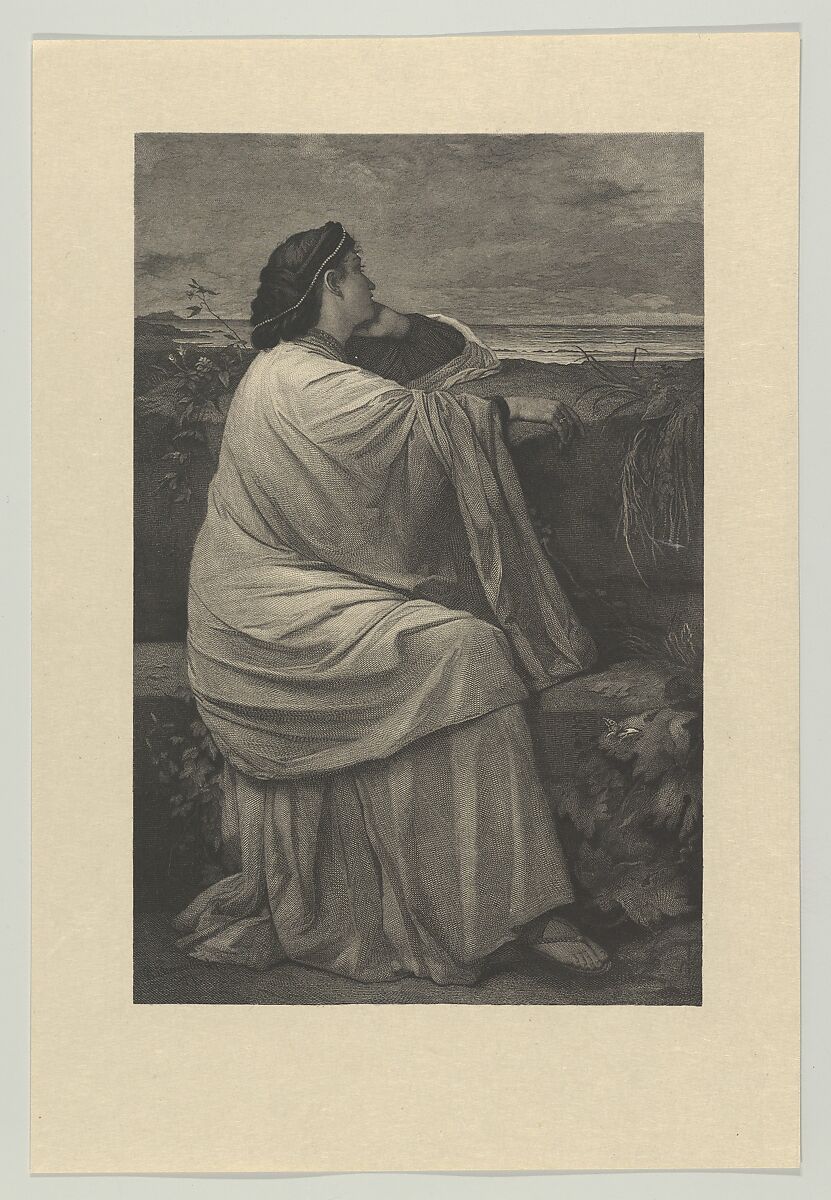 This print was made to mark the acquisition of the related painting by Feuerbach by the Staatsgalerie in Stuttgart in 1872. Greek legend records how the goddess Artemis saved the princess Iphigenia from sacrificial death at the hands of her father Agamemnon, then transported her to the island of Taurus to become a priestess. The leading German neoclassical painter imagined Iphigenia's sadness and isolation, and posed his model Lucia Brunacci to echo an ancient statue, "searching for the land of the Greeks with her very soul."
