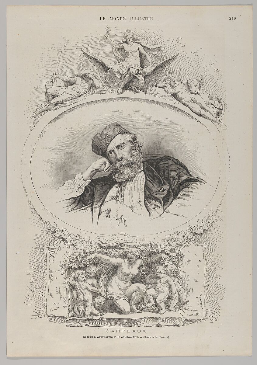 The sculptor Carpeaux died on October 12, 1875 and this full-page tribute appeared a few days later in the French weekly newspaper "Le Monde Illustré." His likeness, based on a photograph by Numa Blanc, is framed by two of his sculptural works: "Imperial France Bringing Light to the World and Protecting Science, Agriculture, and Industry" above, and "The Triumph of Flora" below. Both groups decorate the south façade of the Pavillon de Flore at the Musée du Louvre, Paris and were unveiled in 1866.