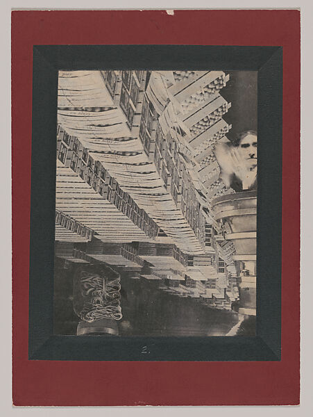 - Medium: Cut and pasted printed papers, black masking tape on paperboard with dark red facing paper