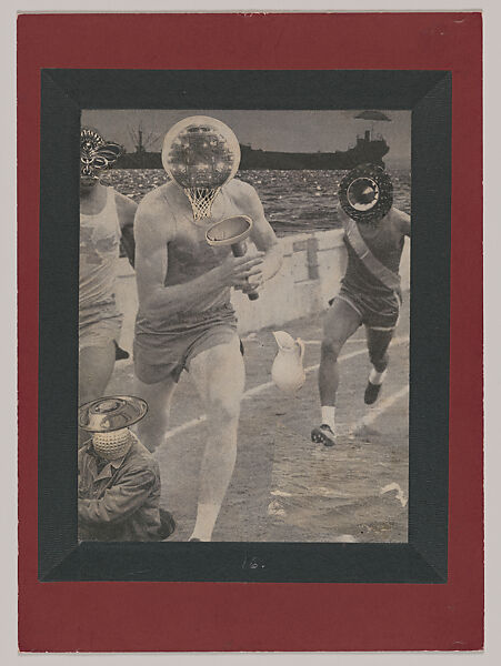 - Medium: Cut and pasted printed papers, black masking tape on paperboard with dark red facing paper