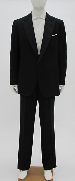 The tuxedo emerged as semi-formal eveningwear in the mid-1880s, based on a design for a tailless dinner jacket commissioned by the Prince of Wales, later Edward VI. The term “tuxedo” derives from the suit style worn by prominent members of society in the New York City suburb, Tuxedo Park. Today, the suit consists of a black jacket with peaked lapels or a shawl collar in grosgrain or satin and trousers with a satin stripe at the side seams. The suit is traditionally worn with a white collared shirt, black bowtie, and black cummerbund. This bespoke tuxedo was made by the Savile Row tailors Fallan & Harvey, founded by Keith Fallan and Peter Harvey on Sackville Street in 1975.