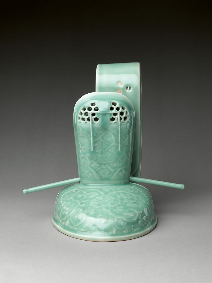 Over a relief pattern of peonies and scrolling vines, this incense burner is coated with one or more thick layers of glaze, characteristic of Nabeshima-type celadon ware. The vessel’s complex form is modeled after the headwear of courtiers of the Heian period (794–1185). As revealed in the macrophotograph, it was constructed from multiple porcelain sections that were precisely joined, pierced, carved, and stamped, with details such as the stylized cord then applied in relief. At the back, the folded porcelain “tail”—originally made slightly lower than the cap’s edge—has broken and been restored several times, testifying to both the object’s fragility and its enduring value.